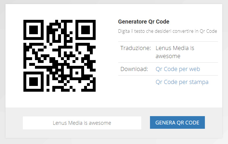 Abbiamo pubblicato sul nostro blog una spiegazione articolata sui Qr Code aggiungendo anche un simpatico tool per aiutare gli utenti a generare il proprio codice Qr code “al volo”. Utilizzando una scrittura SEO, pensata cioé per i motori di ricerca, l’articolo si è posizionato in prima pagina di Google ottenendo molto traffico organico (circa 2000 visite ogni mese con punte di 3500 contatti). In maniera predefinita il Qr Code che proponevamo indicava proprio la frase “Lenus Media is awesome”.